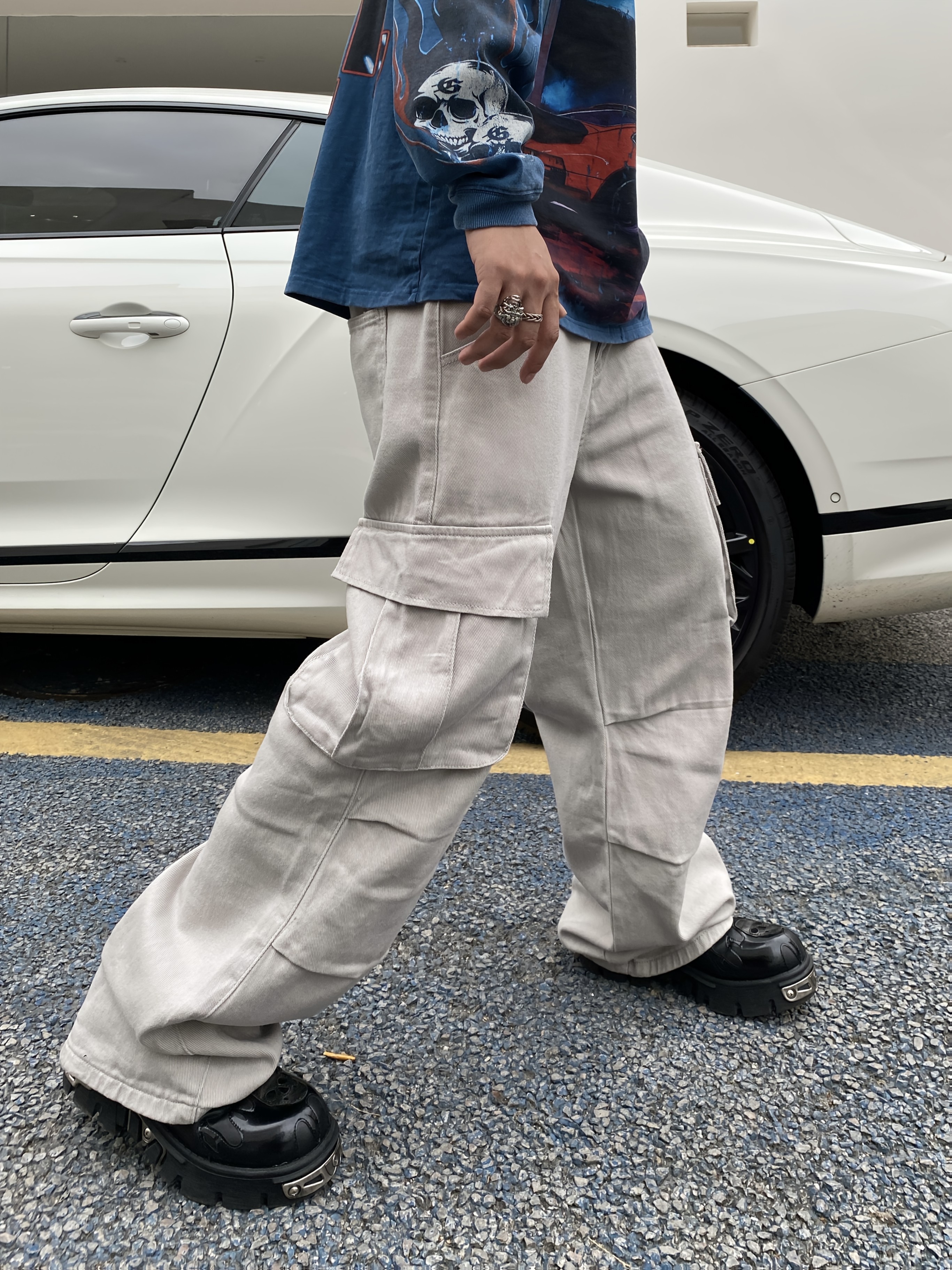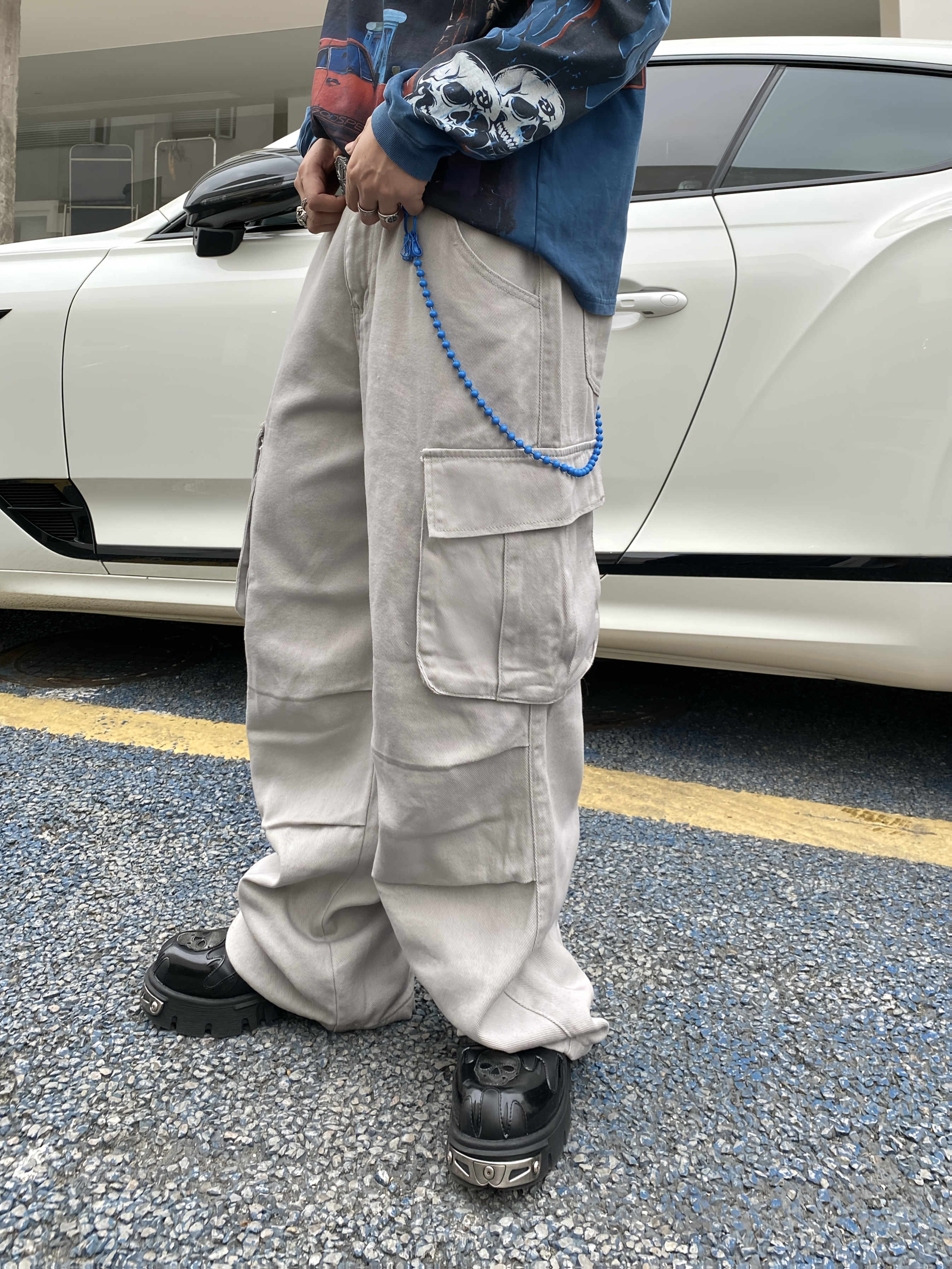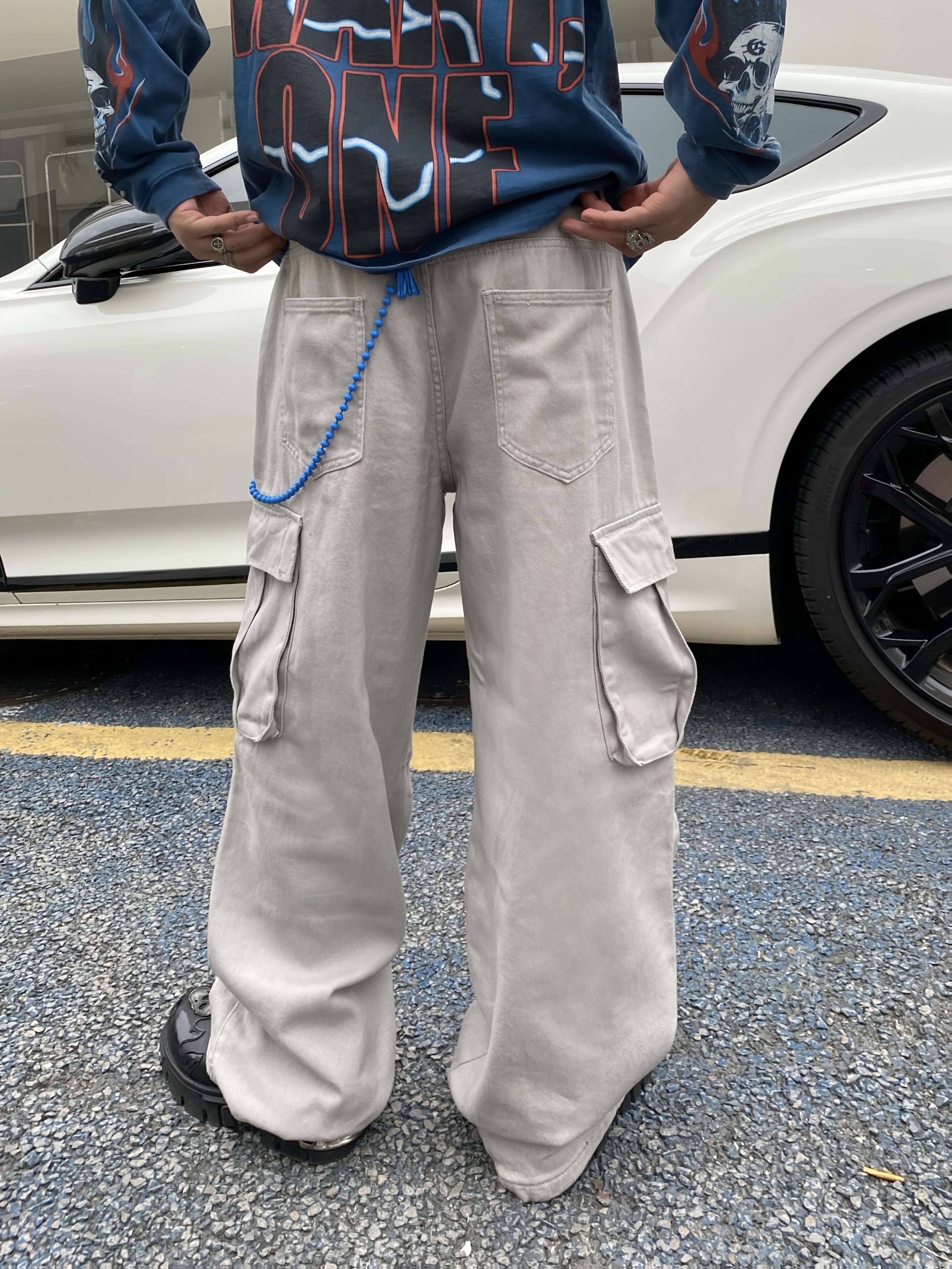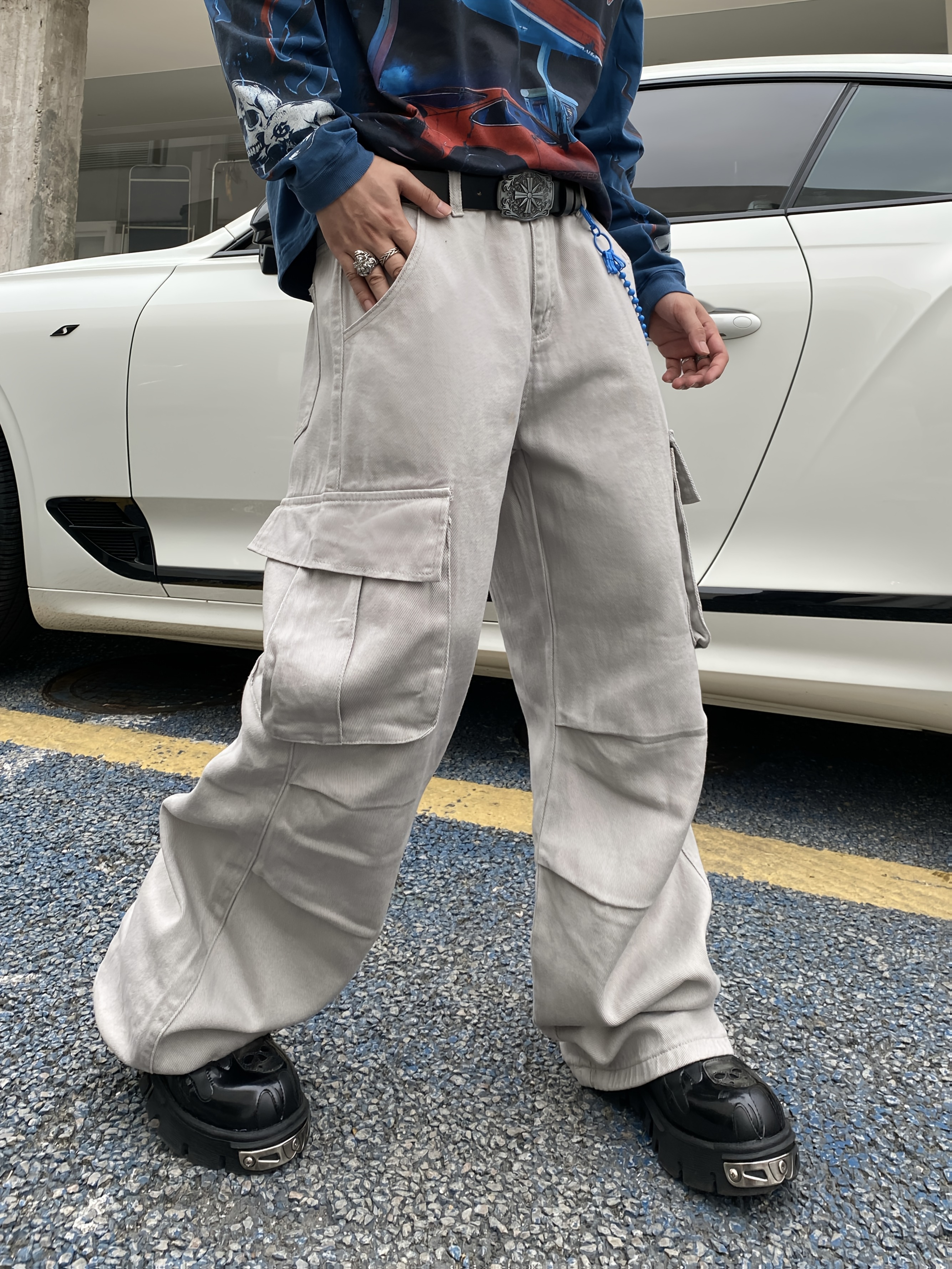 1pc Vintage-Inspired Street Style Loose-Fit Cargo Jeans for Adults, Solid Color Cotton Fabric, Non-Stretch, Multiple Pockets, Regular Length, All-Season Woven Trousers