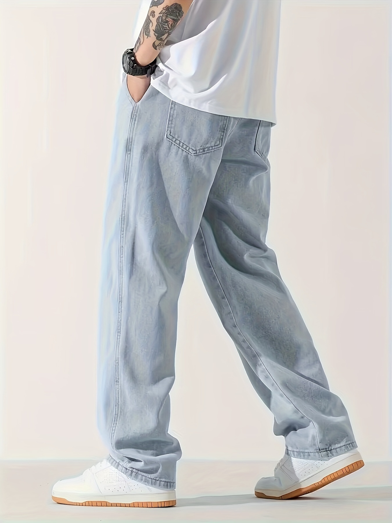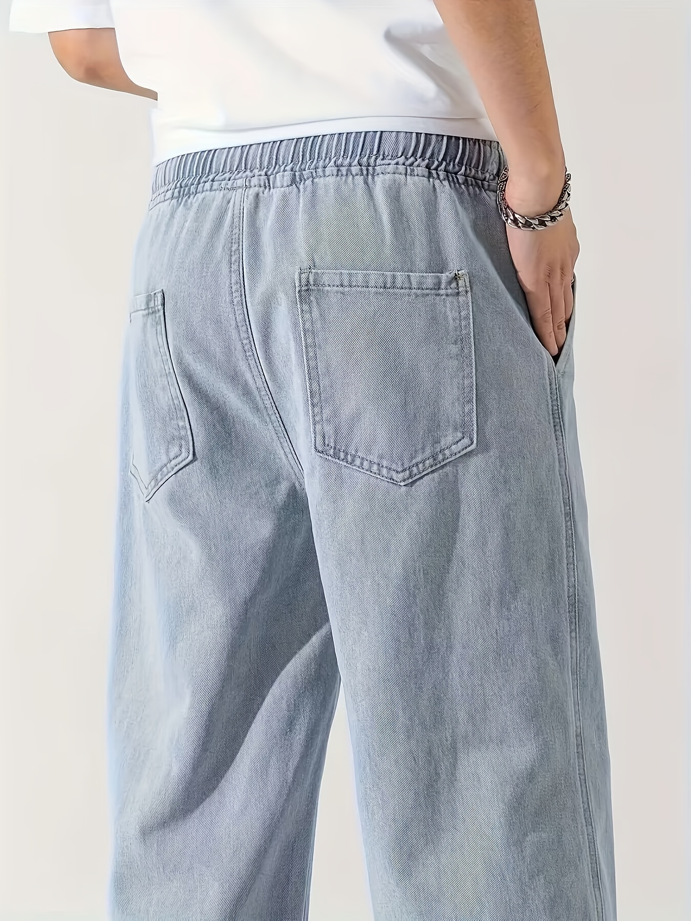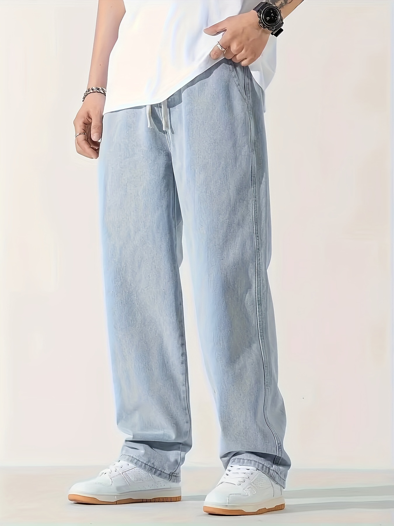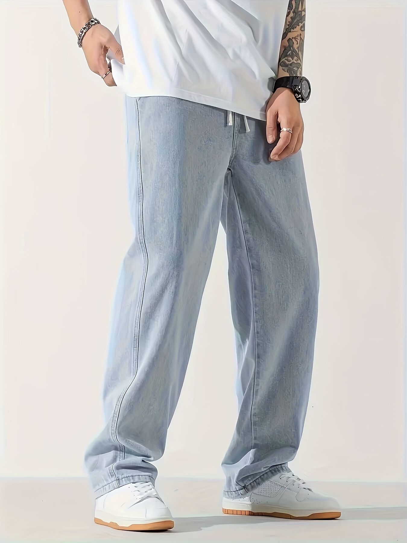 Men's Casual Light Blue Jeans, Loose Straight Trousers, Versatile Drawstring Elastic Waist Band Long Pants