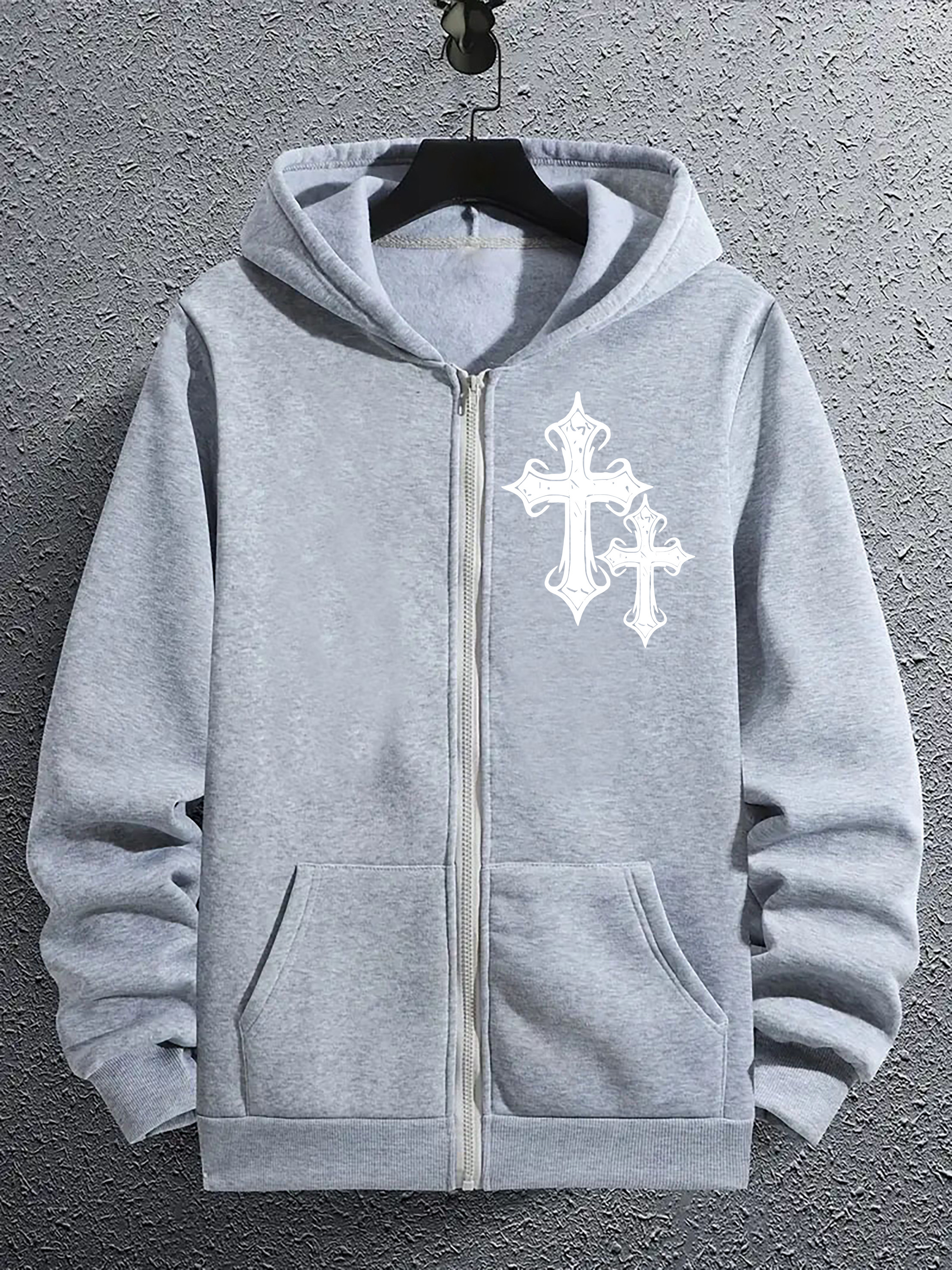 Men's Fashion Geometric Cross Print Hoodie with Comfort Pockets, Full Zip Regular Fit Polyester Knit Fabric Hooded Sweatshirt with Slight Stretch - All Season Style