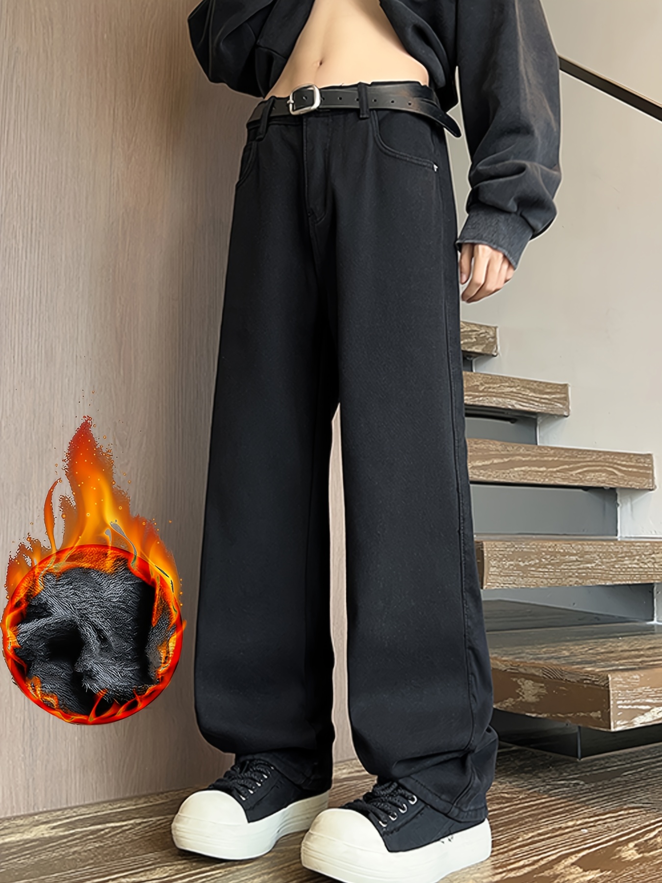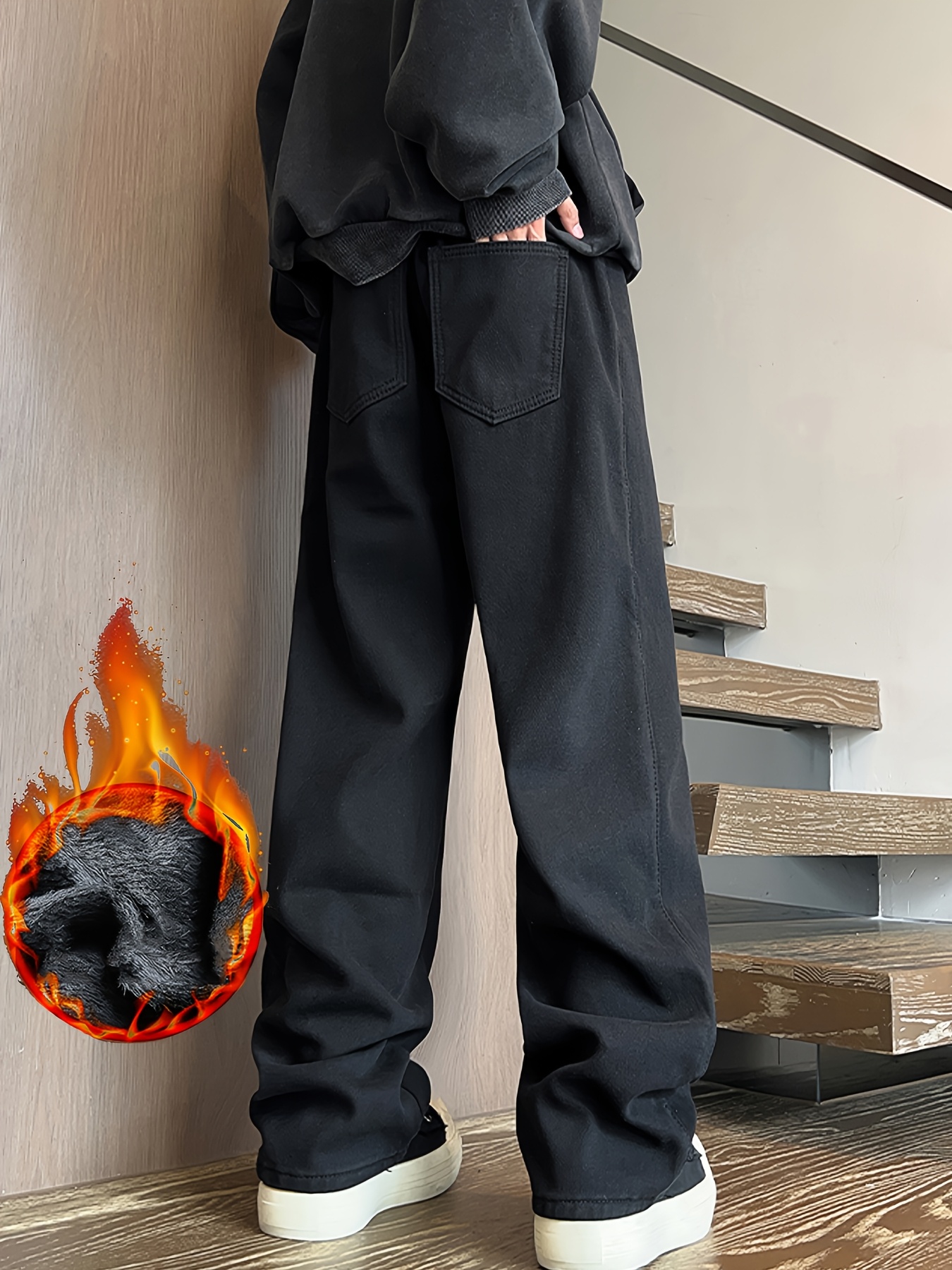 Men's Vintage-Inspired Fleece-Lined Jeans - Casual Straight Leg Denim for Fall/Winter, Machine Washable