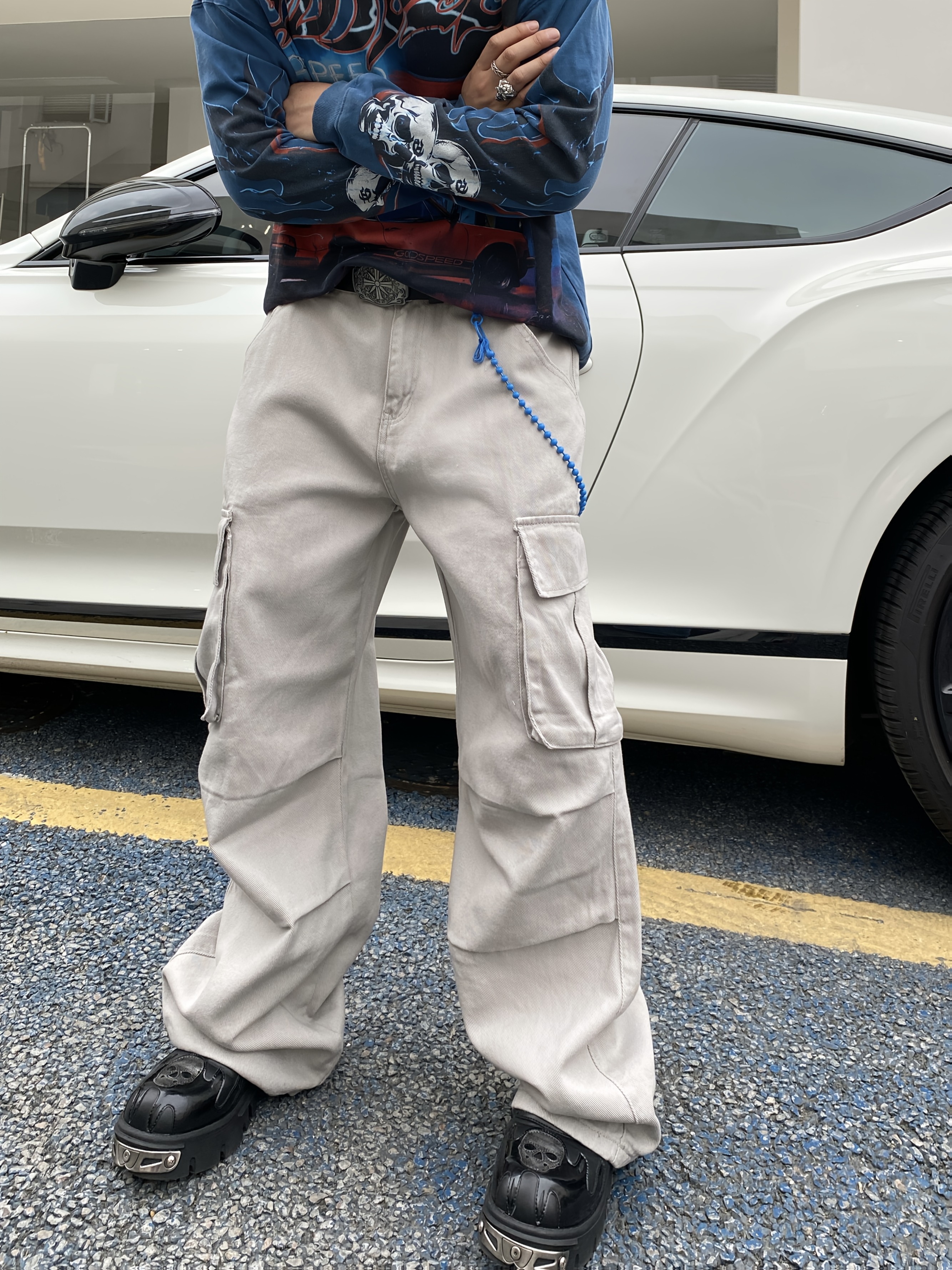 1pc Vintage-Inspired Street Style Loose-Fit Cargo Jeans for Adults, Solid Color Cotton Fabric, Non-Stretch, Multiple Pockets, Regular Length, All-Season Woven Trousers
