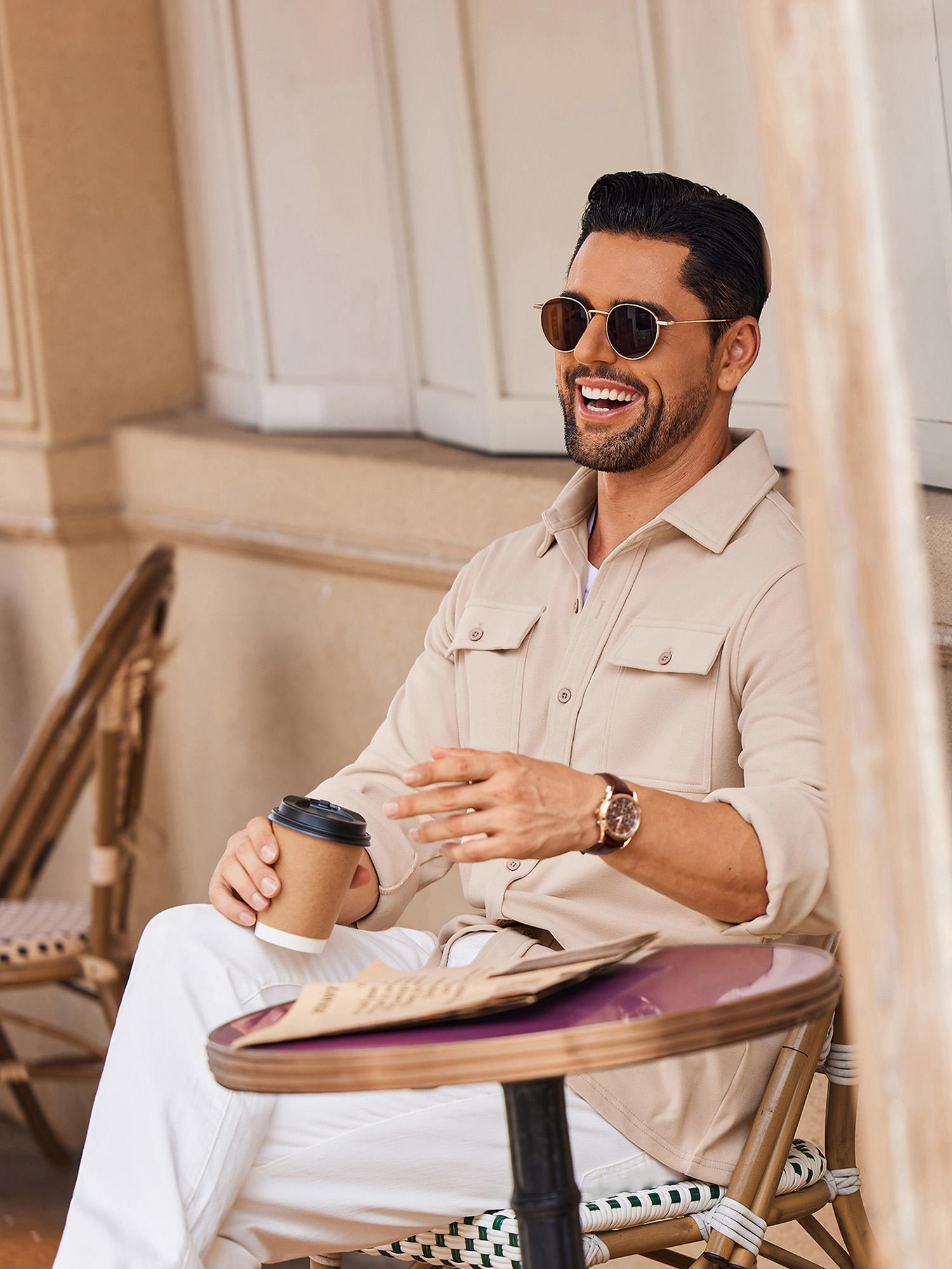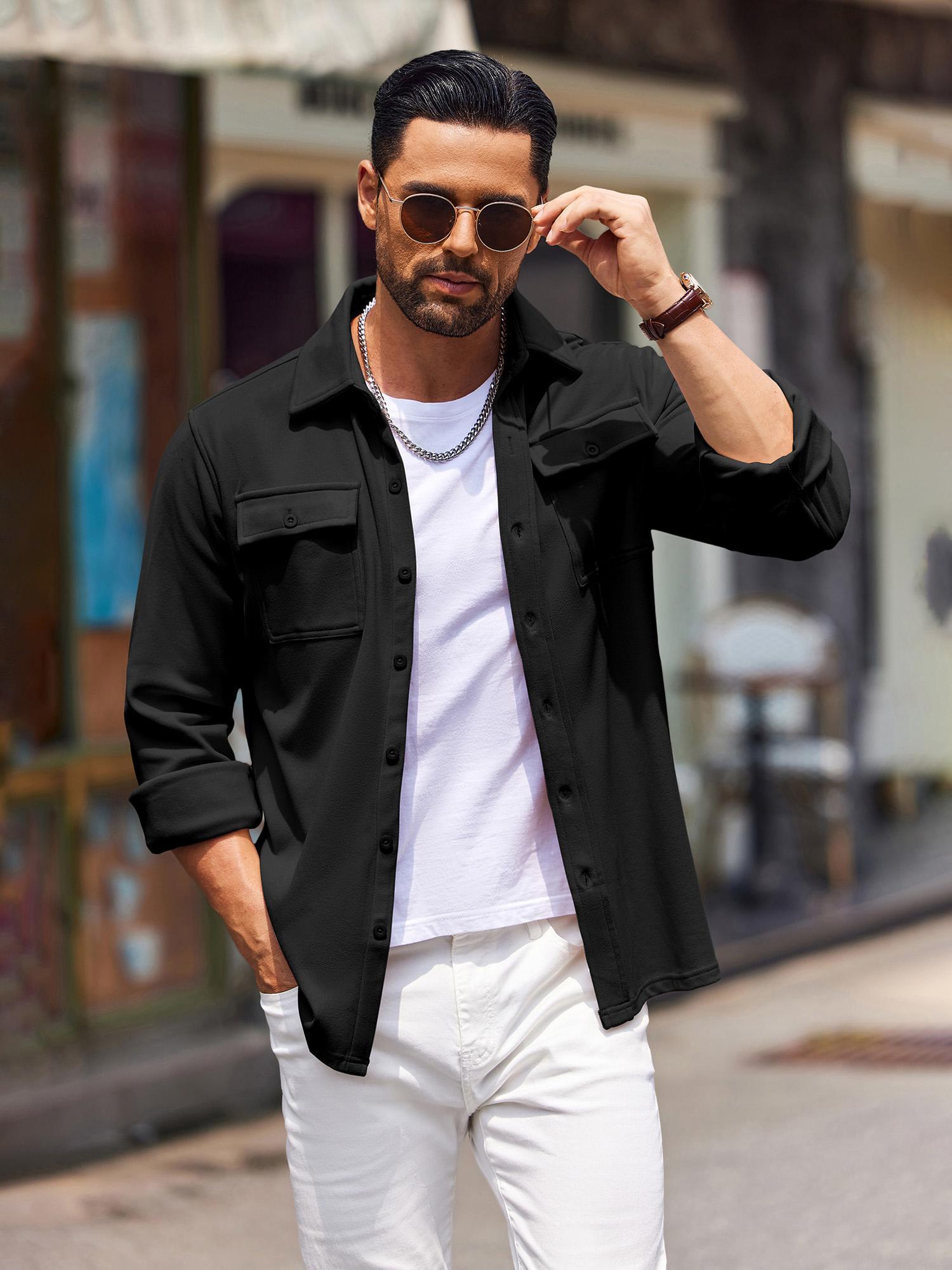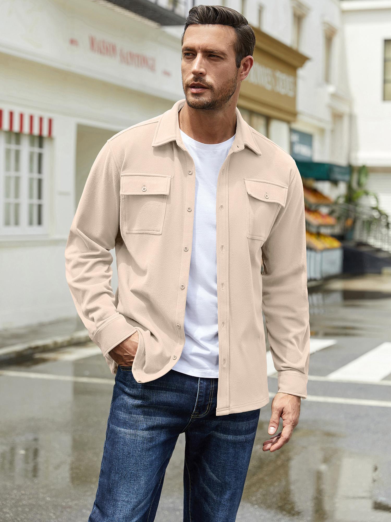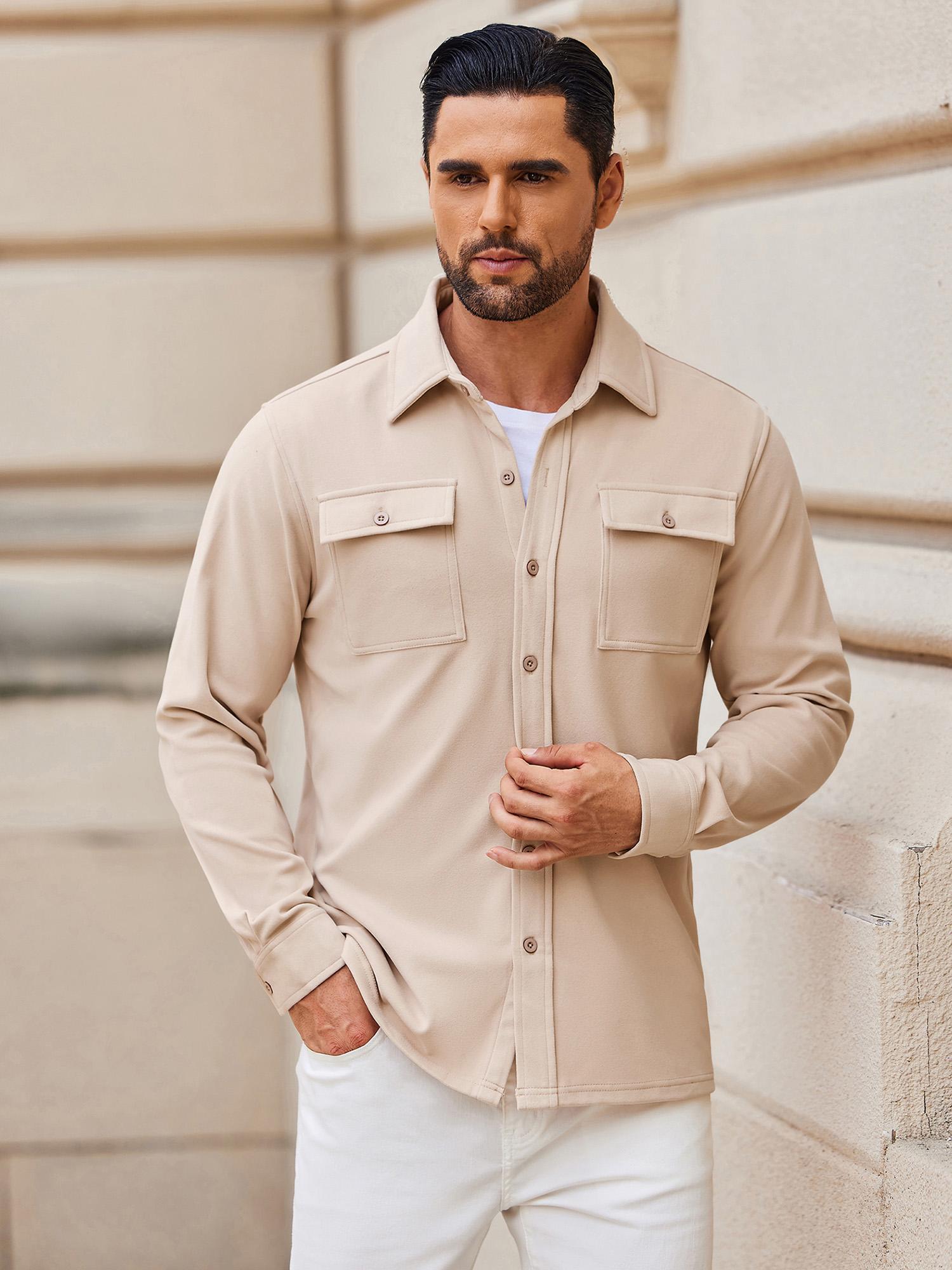 1pc Men'S Casual Polyester Shirting Jacket - Solid Color Long Sleeve Button Down Shacket with Pockets, Non-Stretch Knit Fabric, Regular Fit for Spring/Fall